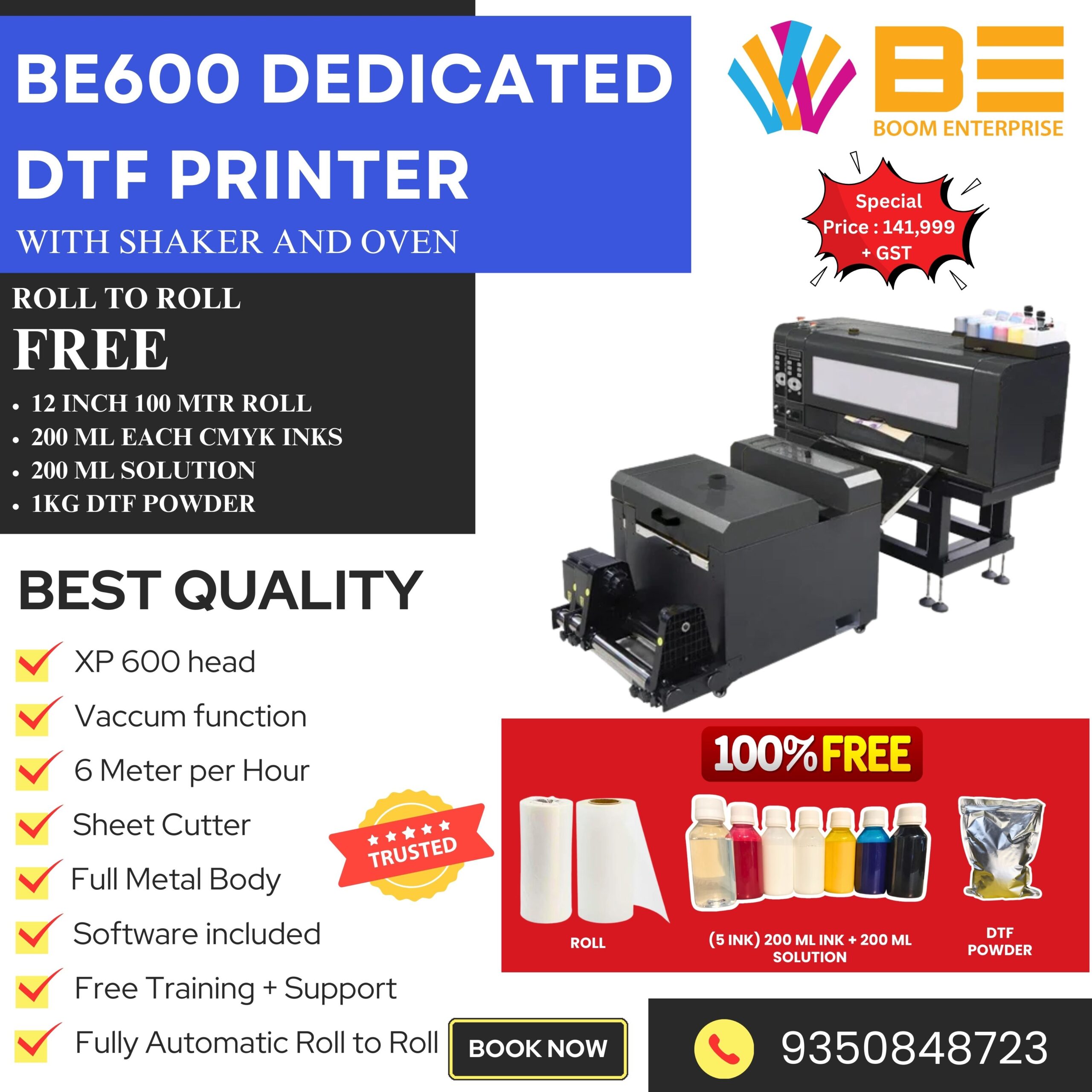 FREE : 200 ML each 5 Ink Set + 200 ML Solution + 1 KG DTF Powder + 12 Inch Pet Film Roll